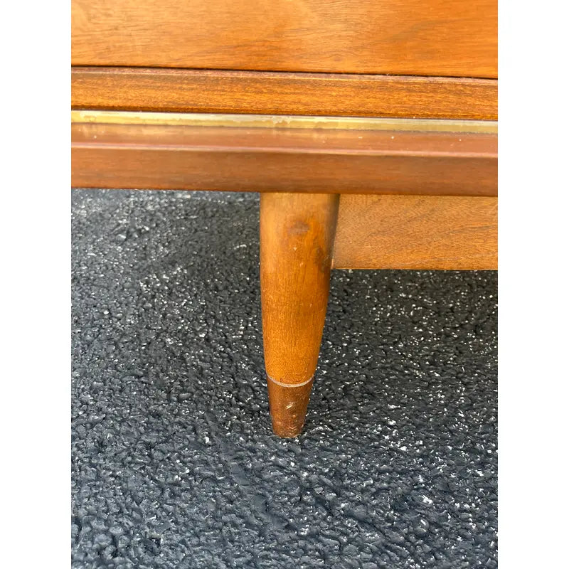 A stunning piece of mid-century modern furniture by Hooker in their Mainline furniture collection. Sought after by individuals as one of Hooker Furniture’s most popular collections, the Mainline series epitomizes the mid-century modern styled movement. Beautiful walnut construction with peg legs and unique silvered drawer pulls define this dresser. Two reversible sliding doors reveal a total of six drawers, two half-width, and four quarter-width. Each door features two faces with beautiful walnut on one side, and woven wicker on the other. Four side-by-side drawers sit immediately below the dresser top. This piece is in superb condition. An excellent find.
