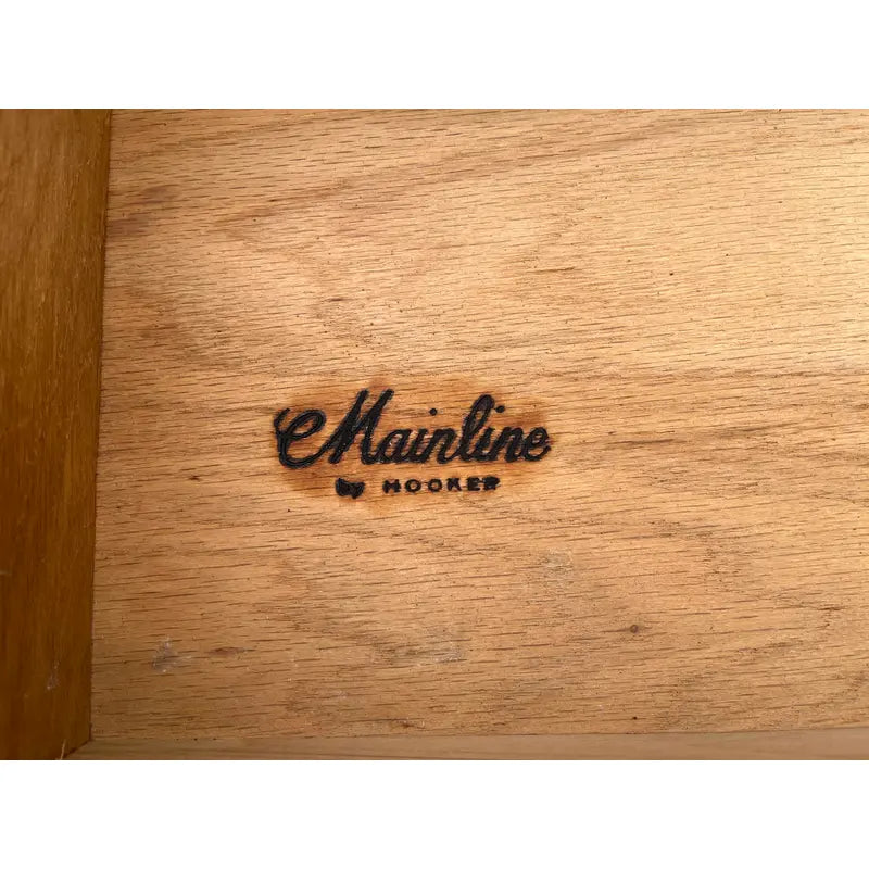 Newly refinished, this stunning walnut chest of drawers in Hooker’s Mainline collection deserves a spot in any mid-century modern atmosphere. On four spun legs and with a classic danish modern body style of simple and straight, clean, lines, this chest of drawers epitomizes the mcm style. Features four full-width stacking drawers for abundant storage. A bright walnut color, mimicking cherry in its luster, is used throughout construction. Oval brass drawer pulls compliment the color and style of design, and finalize a luxurious vintage piece.
