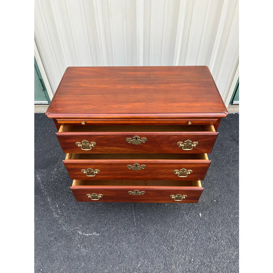 Made by Statton Americana for their Trutype collection. This Nightstand or Bachelor's chest features bright cherry wood with beautiful grain and color. This chest of drawers contains three stacked full width drawers and a pullout tabletop directly underneath the tabletop. A classic Chippendale design with subtle unique aesthetic variations to the timeless look. Gleaming brass hardware. In fantastic condition.