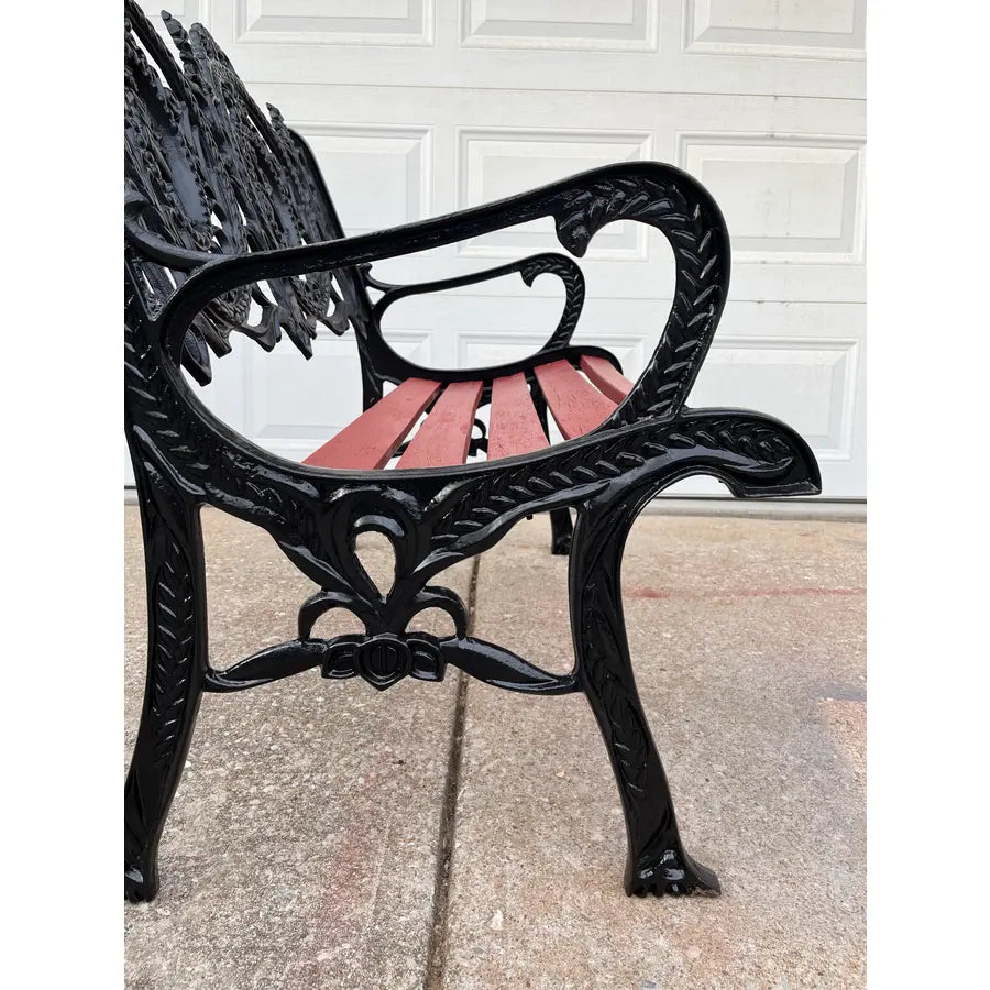 Antique cast iron garden bench with figural imagery of seasons on the back. Features beautiful detail and heavy cast iron framing making it ideal for long lasting durability throughout the years. Oak slatted seat in a dusty brick red is a perfect complement to the black cast iron. Minimal imperfections.