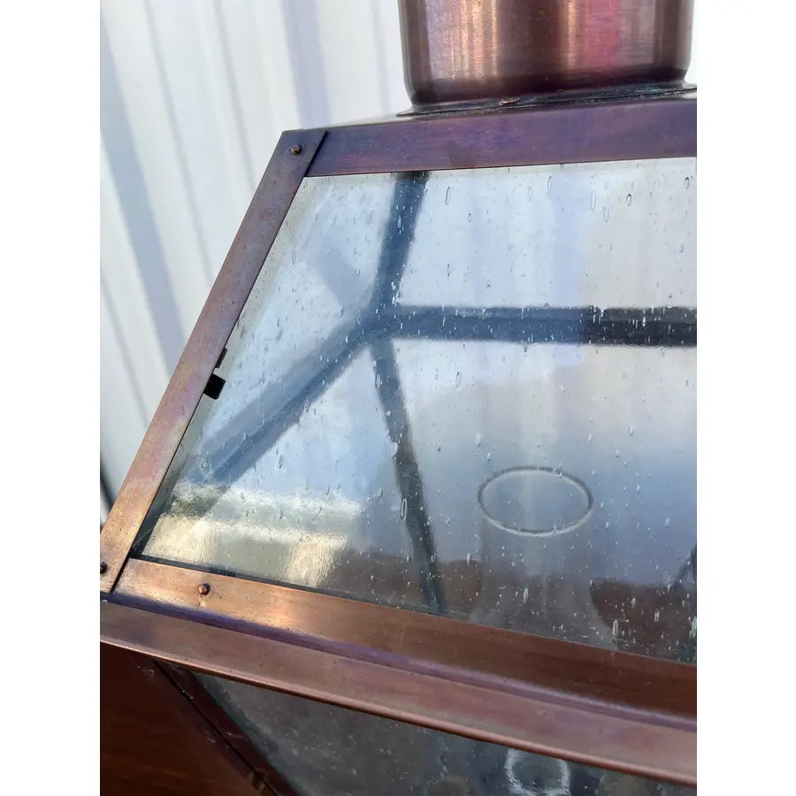 A pair of hand crafted copper lanterns made by Bevolo coppersmiths. Vintage in character and beauty, with heavy French Quarter aesthetic, these copper lanterns are true works of art. Flecked glass replicates drizzling rain in each lanterns illumination. Together with copper tones and interior hurricane glass, these lights exhibit nothing short of a warm flickering glow. Hard wired and safe for use outdoors in wet conditions. Possible for wall mount on any surface. Installation brackets not-included.