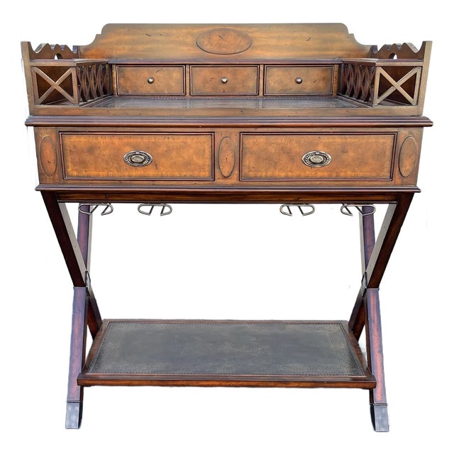 Stunning bar drink server by Maitland-Smith. Made of mahogany wood with embossed copper surfaces. Features five total drawers; three smaller atop the bar and two larger within the body. Enclosed caddies on either side of the bar top allow for secure bottle placement. Campaign stylized elements and a strong, stout frame make for an ideal bar piece with elegant detail and luxurious design.